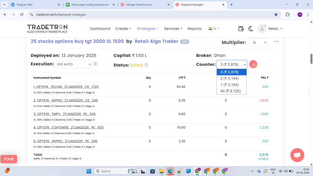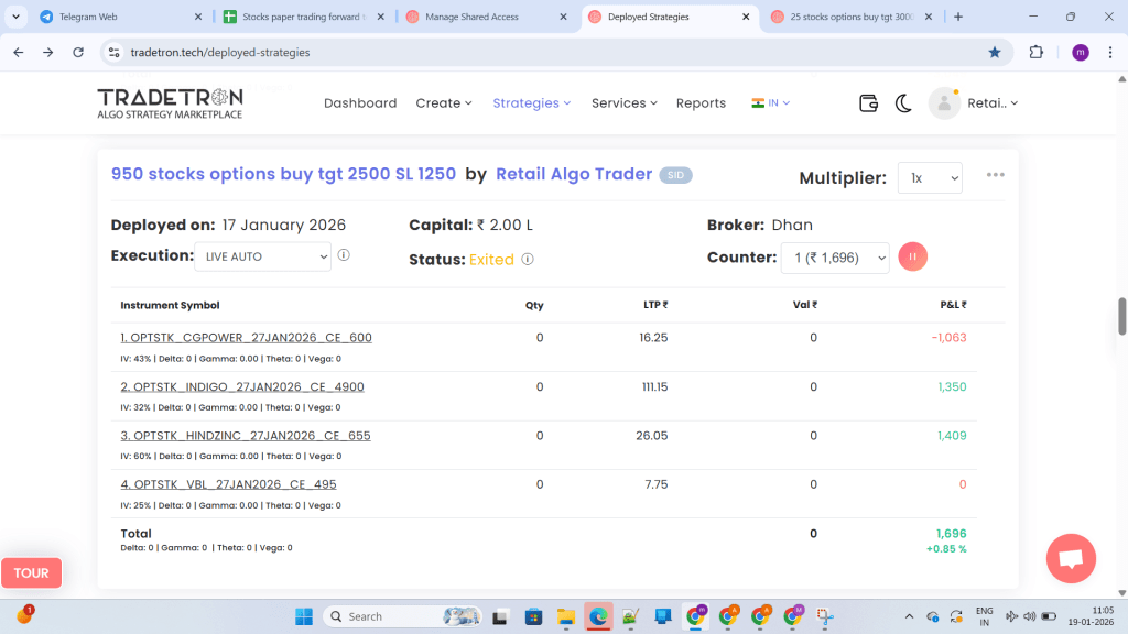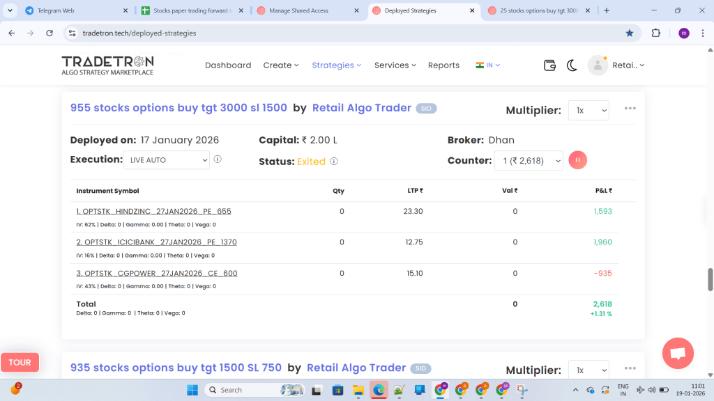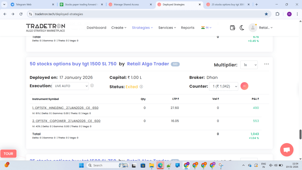 What you see below are REAL deployed strategies, REAL exits, REAL profits, and REAL losses—executed in LIVE AUTO mode on Tradetron with real brokers like Dhan and Shoonya.