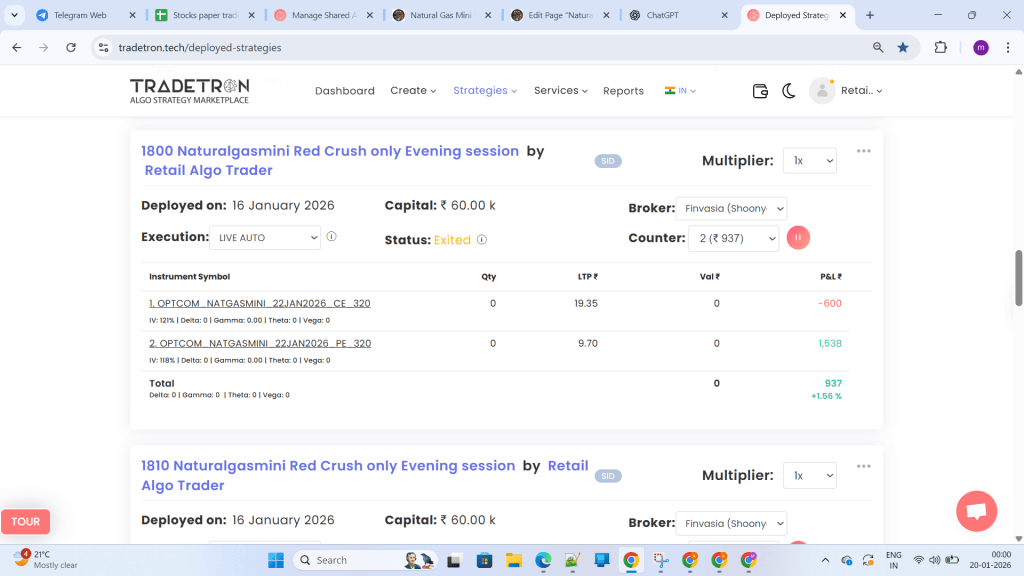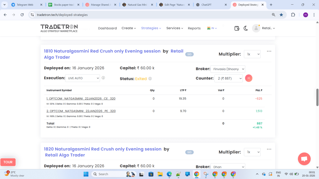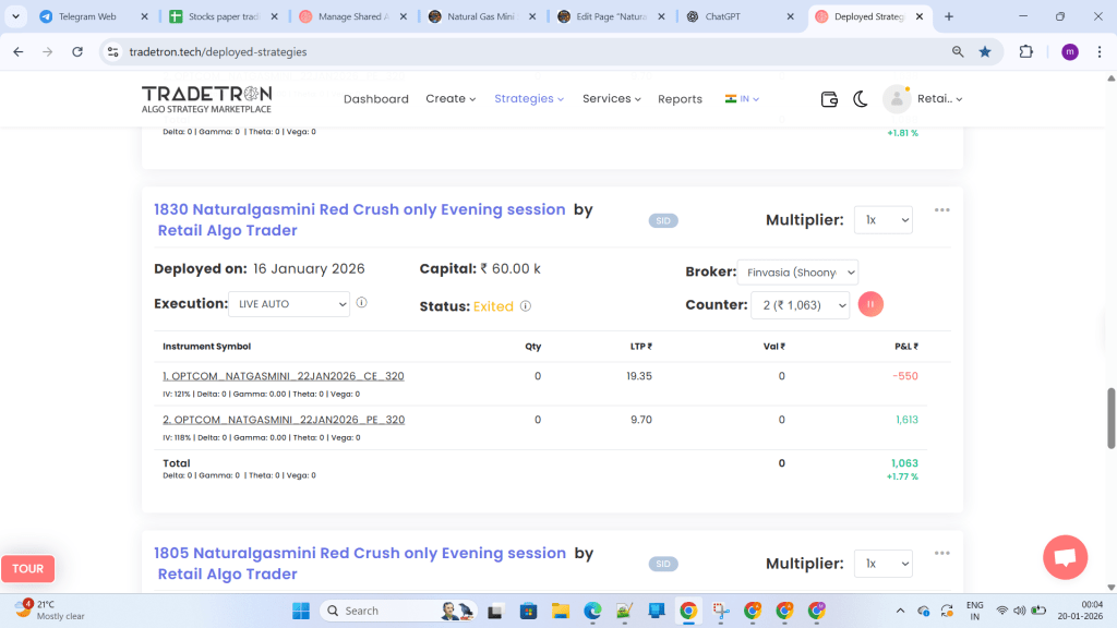 Over the last few weeks, multiple Natural Gas & Natural Gas Mini “Red Crush” Intraday Evening Session strategies were LIVE deployed on Tradetron, executed via real brokers, and closed with profits across different capital sizes.